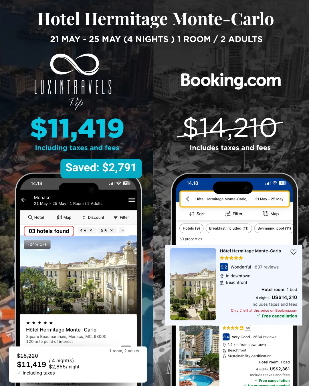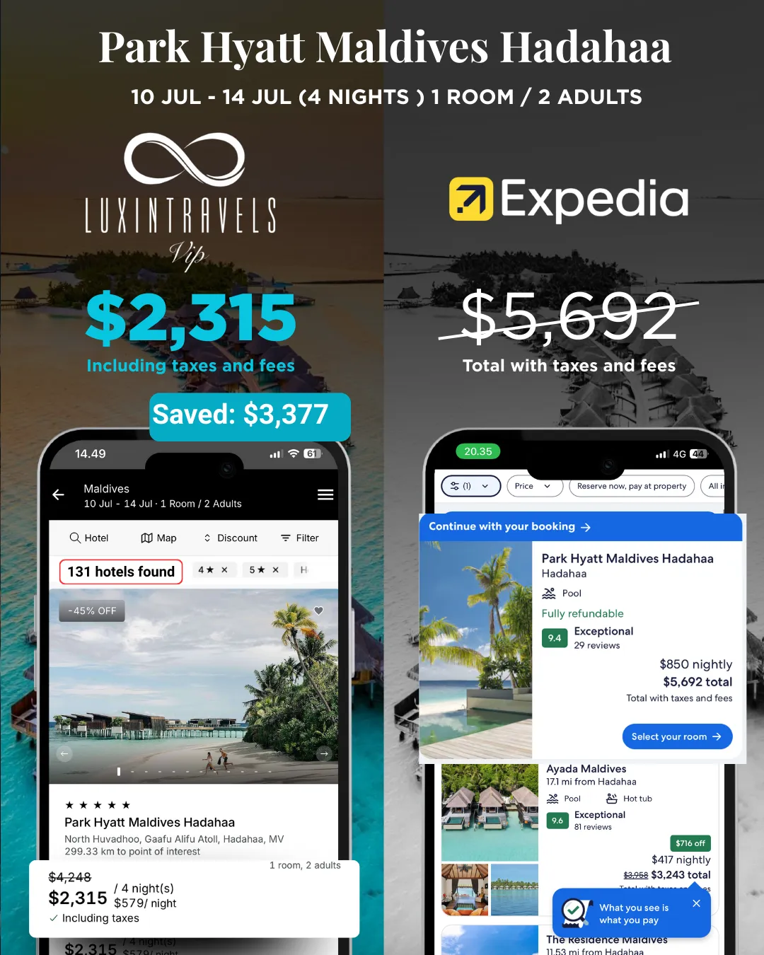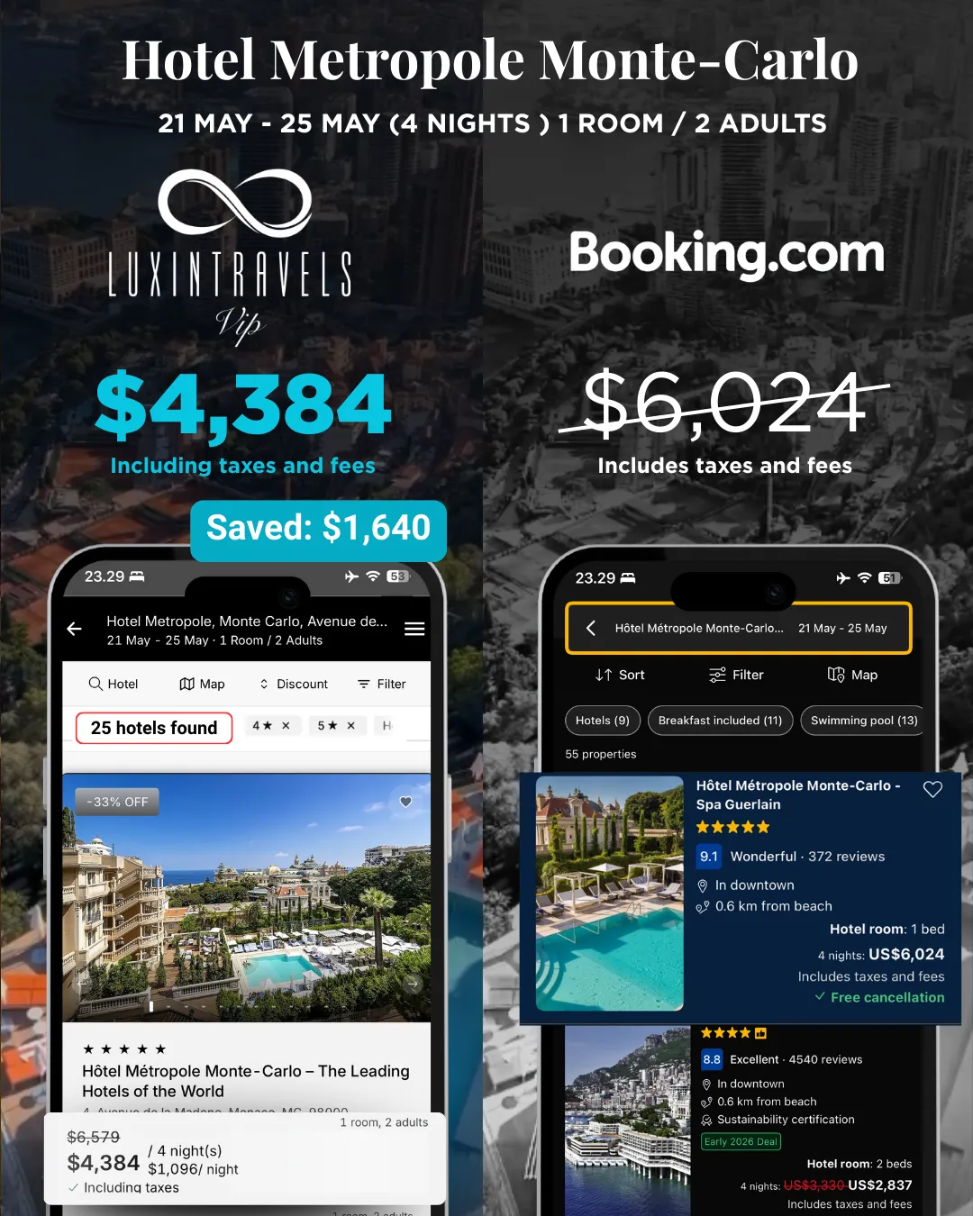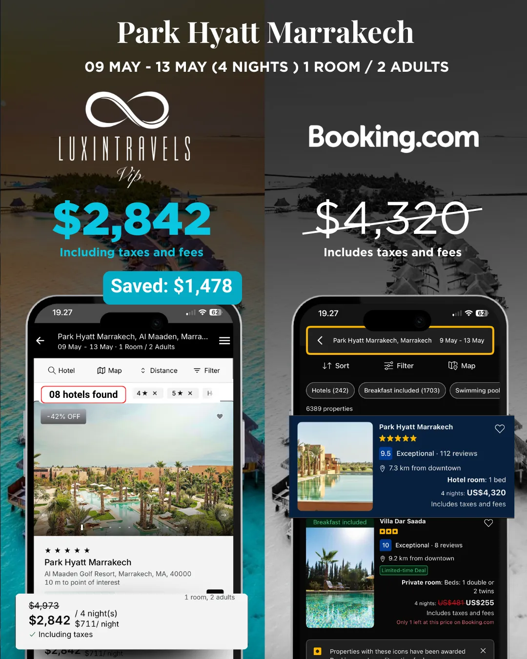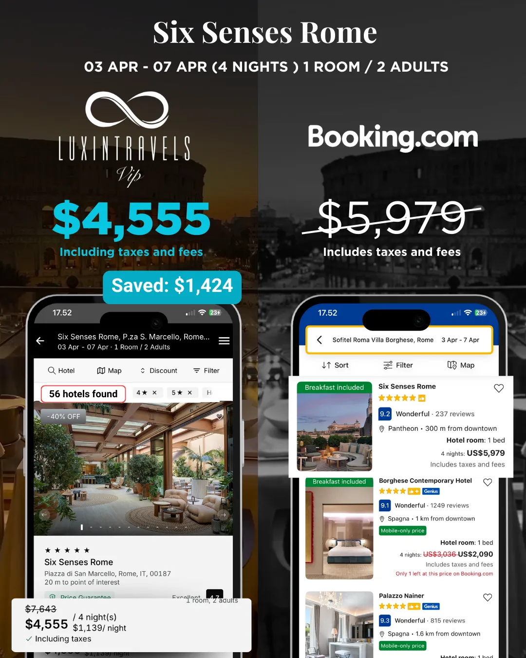 Booking.com veya Expedia gibi yüksek komisyonlar alan ve şişirilmiş fiyatlar gösteren halka açık platformların aksine, platformumuz size özel, yalnızca üyelere özel fiyatlara erişim sağlar; bu fiyatlar genellikle %65'e varan indirimler sunar. Reklam yok, fiyat artışı yok ve aracı yok. Ne görüyorsanız onu ödüyorsunuz. Ayrıca, sadakat puanlarına veya karmaşık sistemlere bağlı değilsiniz; sadece dünya çapındaki lüks otellerde gerçek, önceden belirlenmiş tasarruflar elde ediyorsunuz.
