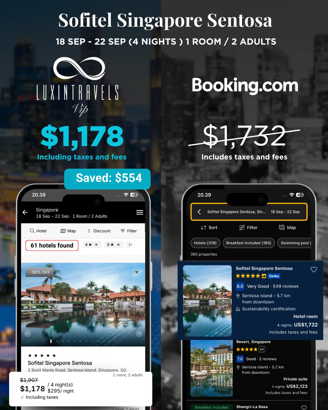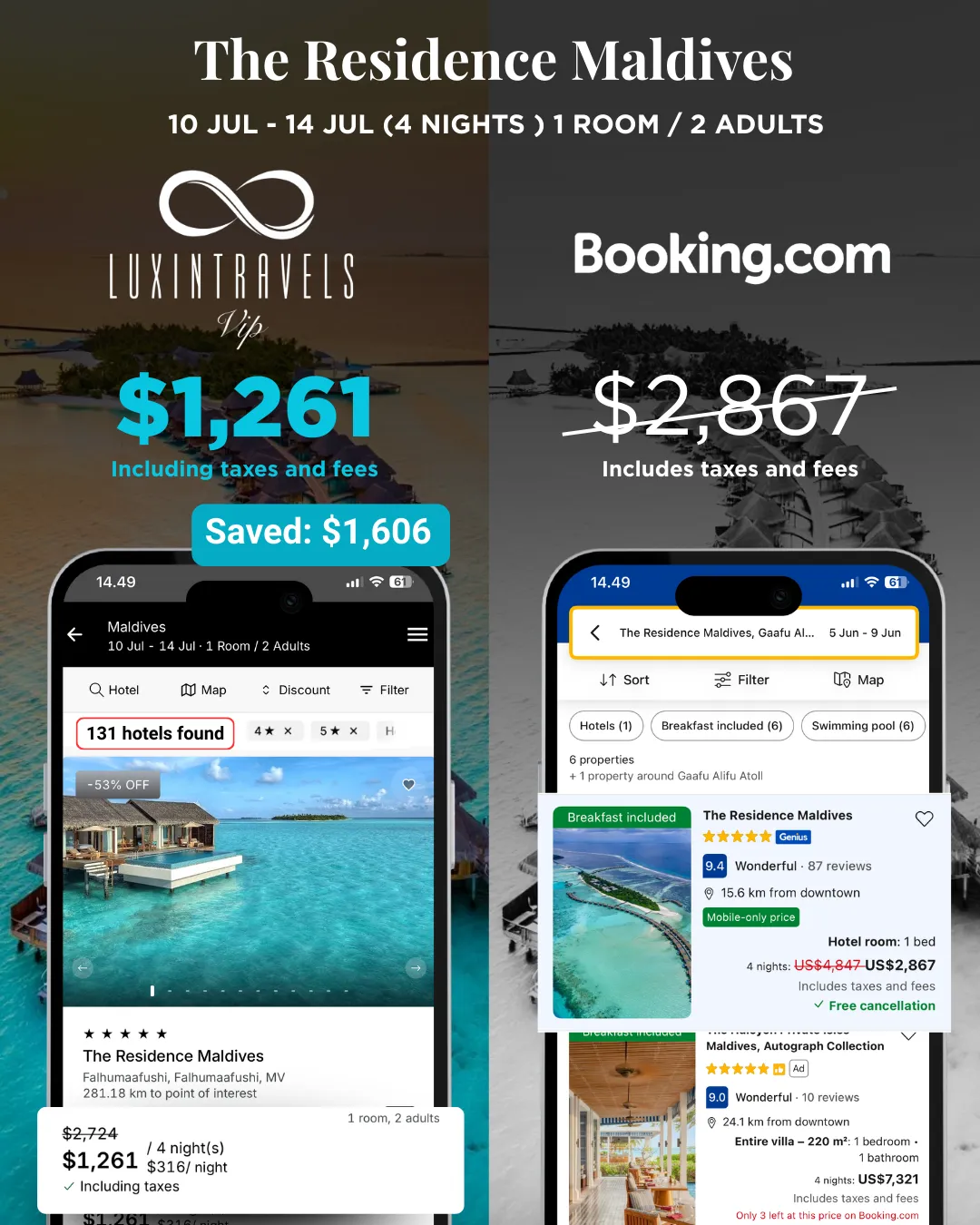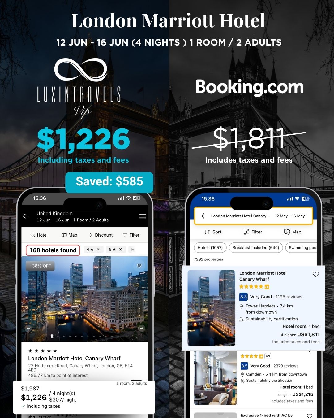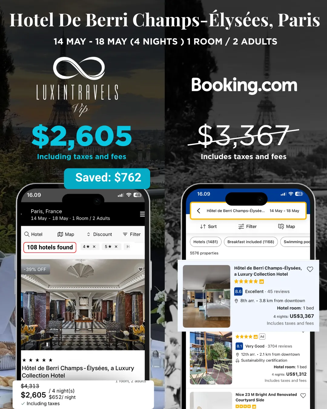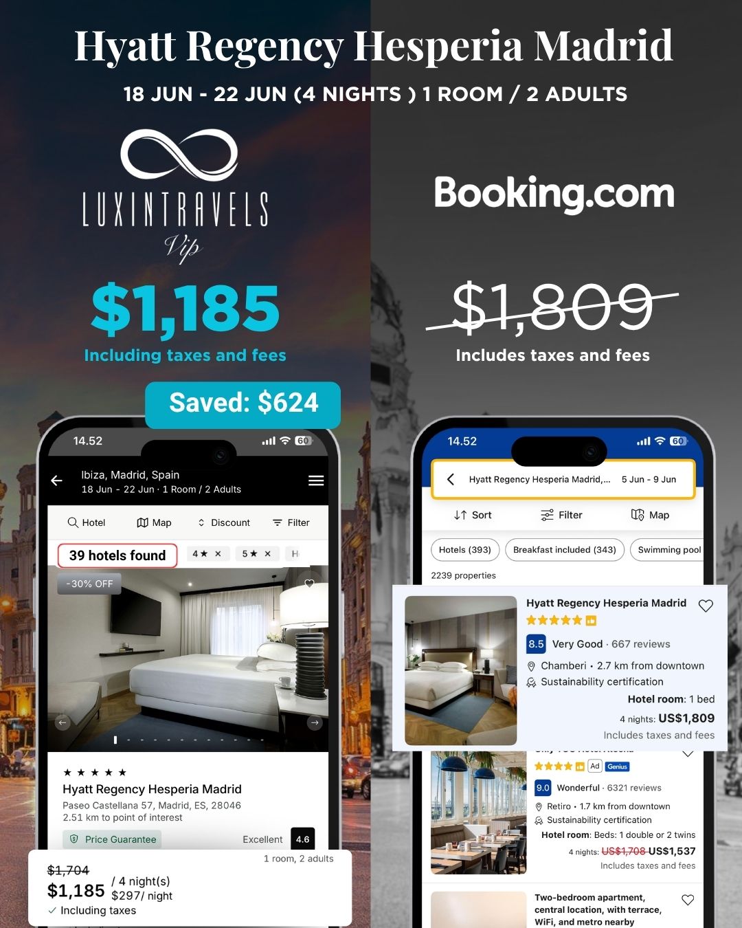 Booking.com veya Expedia gibi yüksek komisyonlar alan ve şişirilmiş fiyatlar gösteren halka açık platformların aksine, platformumuz size özel, yalnızca üyelere özel fiyatlara erişim sağlar; bu fiyatlar genellikle %65'e varan indirimler sunar. Reklam yok, fiyat artışı yok ve aracı yok. Ne görüyorsanız onu ödüyorsunuz. Ayrıca, sadakat puanlarına veya karmaşık sistemlere bağlı değilsiniz; sadece dünya çapındaki lüks otellerde gerçek, önceden belirlenmiş tasarruflar elde ediyorsunuz.